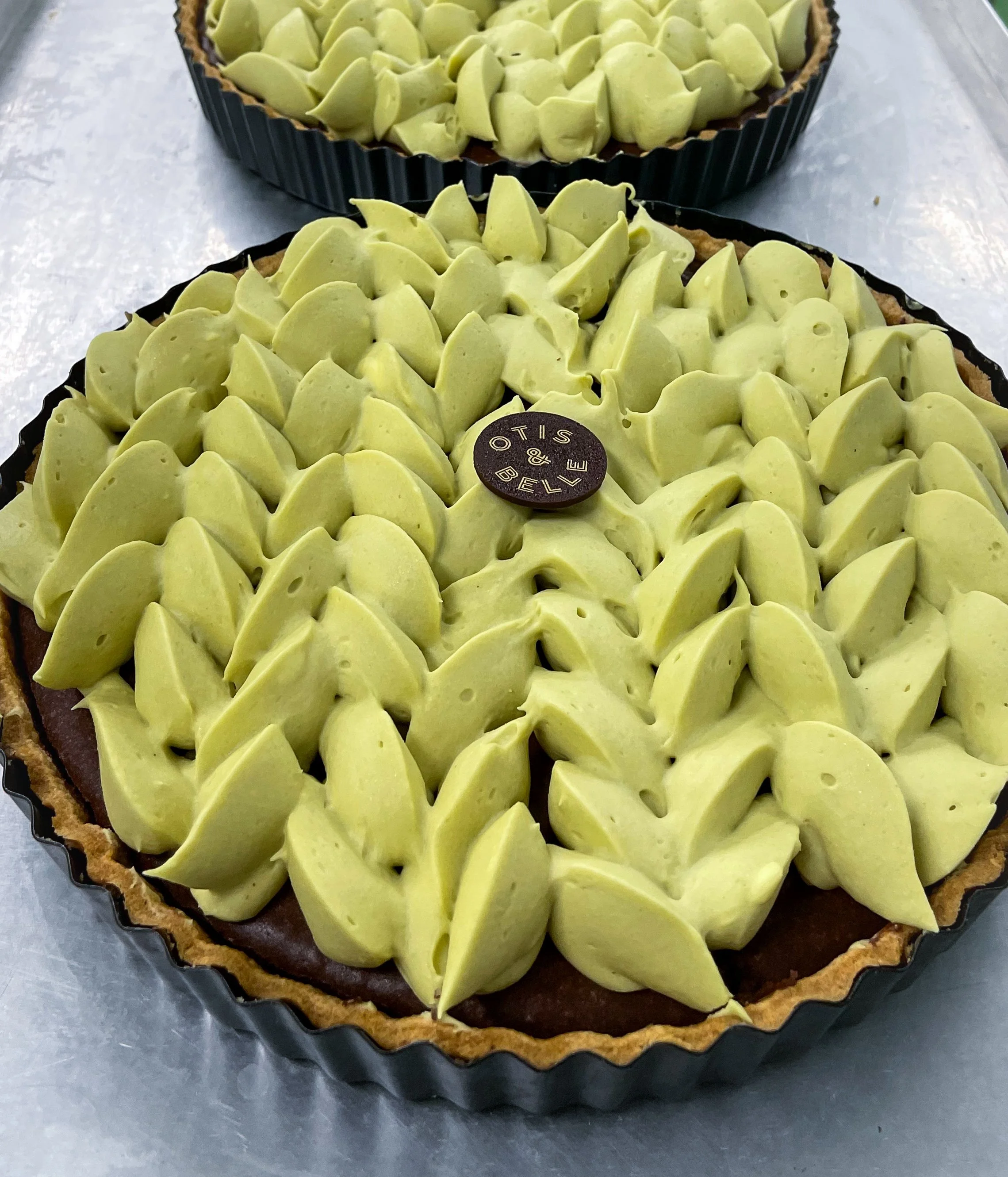 Sweet pastry tart shell carefully baked to a golden crisp, filled with a rich and luxuriously smooth Valrhona dark chocolate ganache, then beautifully topped with a delicate and creamy pistachio crèmeux for an exquisite finish.