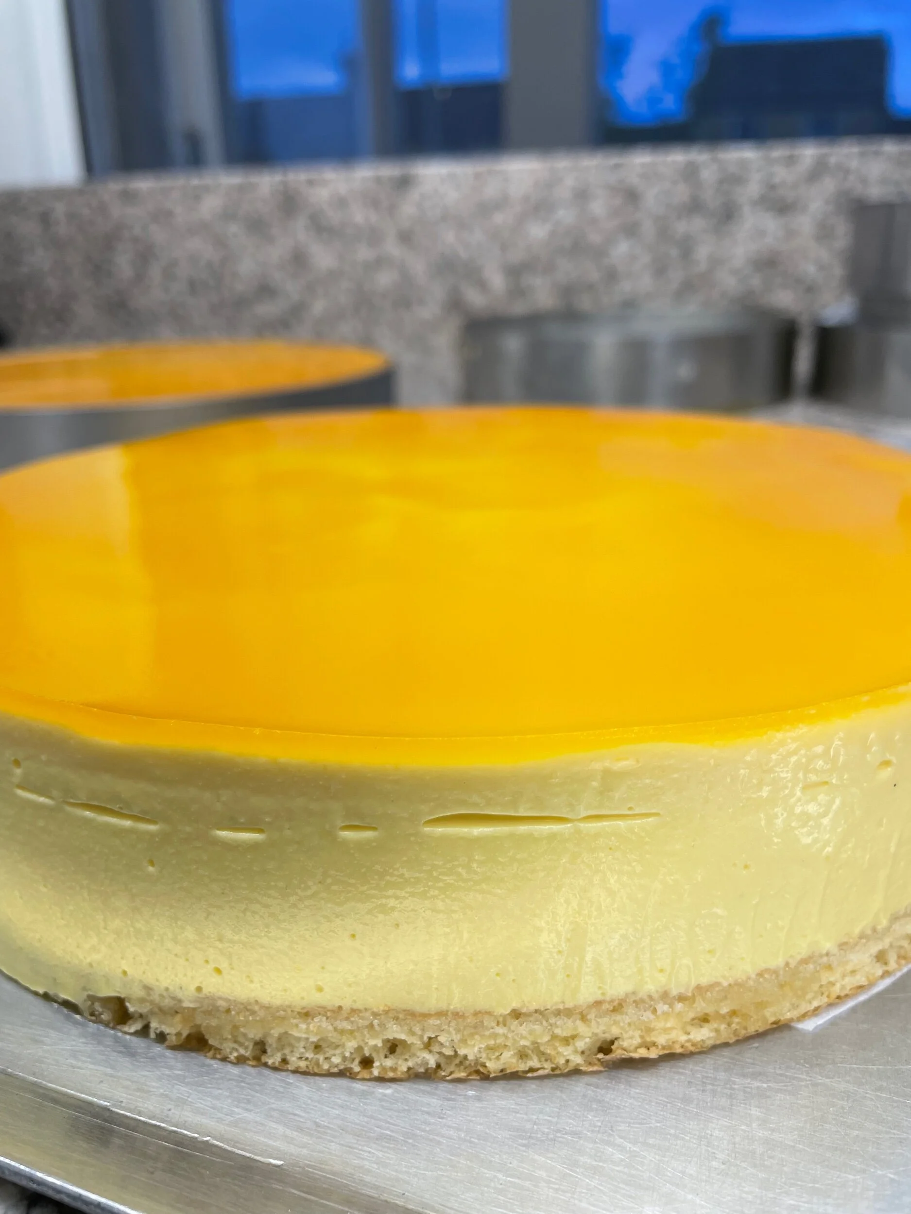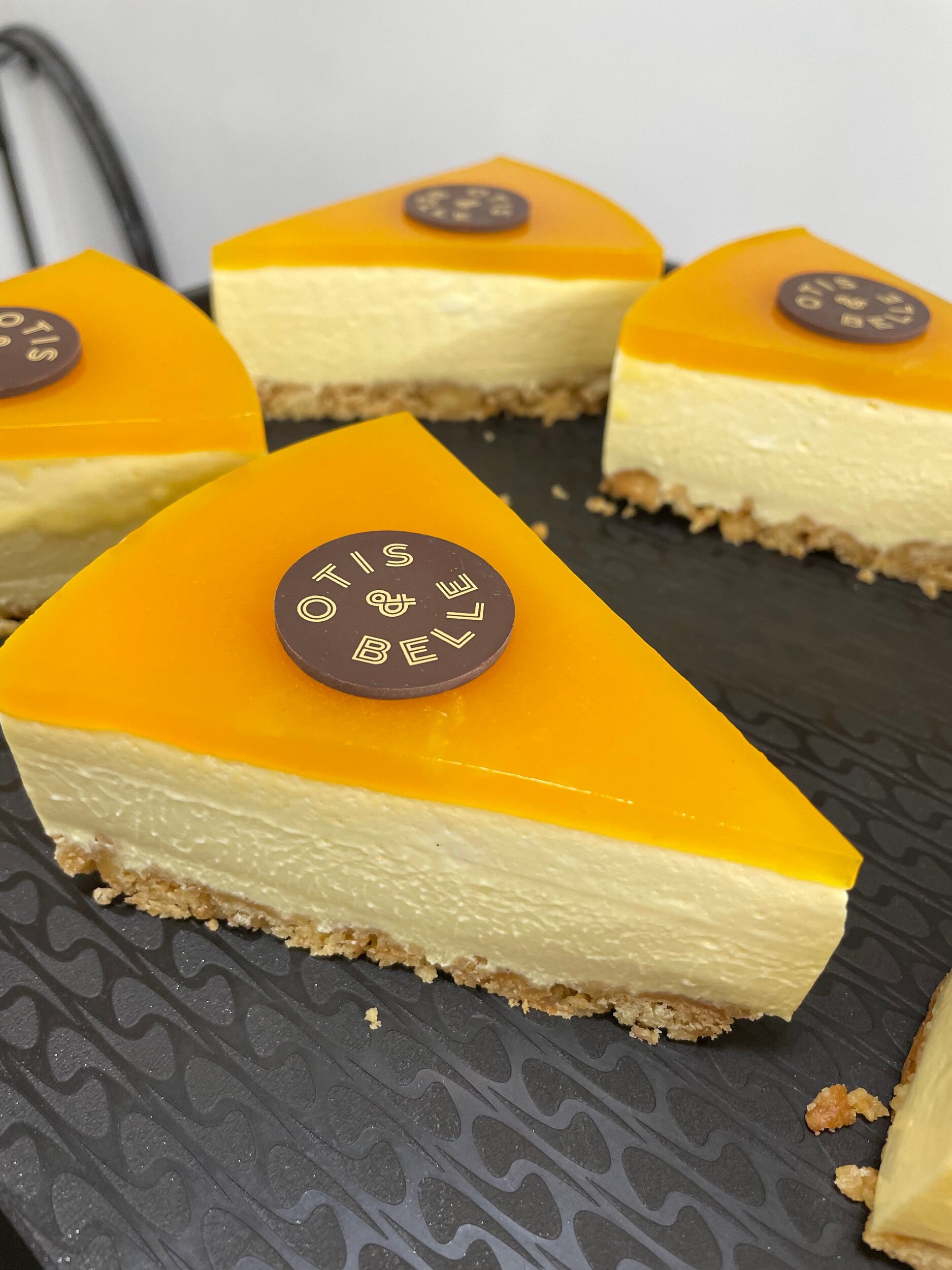 A delightful set vanilla and passionfruit cheesecake, beautifully crafted with a crunchy biscuit base and a smooth, tangy passionfruit jelly topping. An O&B classic! This elegant dessert measures 24cm in diameter and is perfect for serving 8 to 12 people