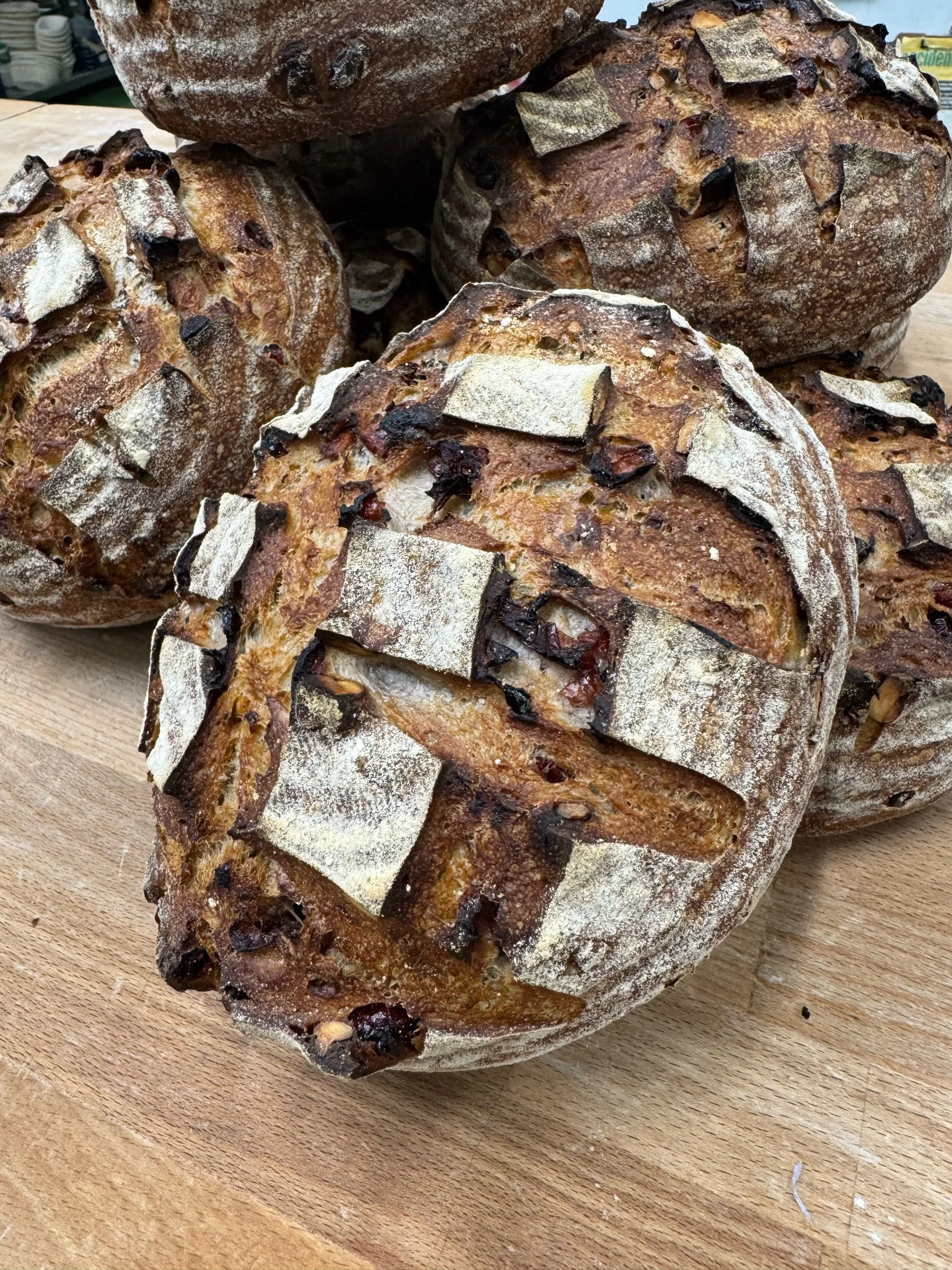 A seasonal twist on our classic sourdough using cranberry & walnuts mixed into the dough - slightly sweet from the cranberry and perfect to pair with cheese!